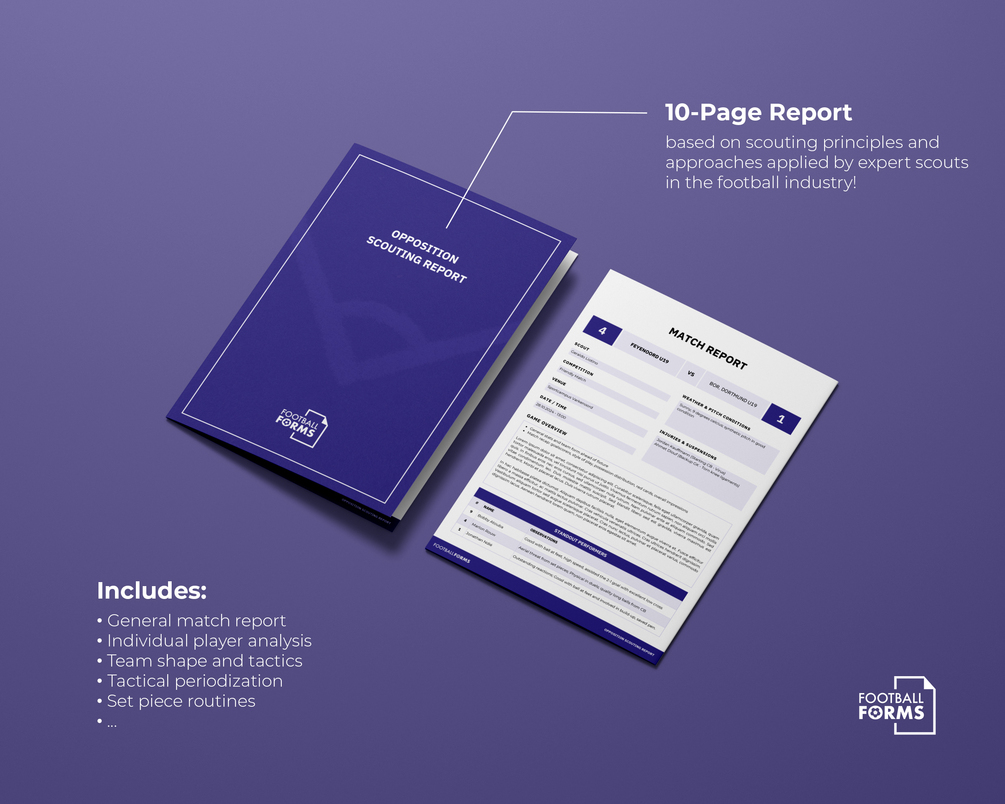 Created based on the principles used by professional football scouts at some of the biggest clubs around the world, our 10-page template is a comprehensive and detailed tool that helps you analyze your opposition thoroughly. Designed with the principles of tactical periodization and phases of play in mind, it provides a deep insight into your opposition's team tactics, patterns of play, set piece routines, individual player strengths/weaknesses, etc. to help you outsmart the opposition!